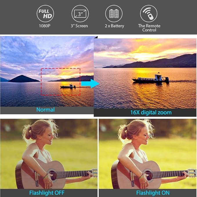 Video Camera:This video camera max supports 1080P(30FPS) AVI Video Resolution,24M (6000x4500) JPEG Image Resolution.3.0 inch 270 degree rotation TFT LCD screen,16X digital zoom,built-in fill light,Anti-shaking,Face detect,Smile capture,Self-timer,Webcam function,Pause function,Beauty function,internal and external Microphone and Speaker(record sound videos),USB 2.0, TV Output and so on.The camera is small,lightweight carry to everywhere and simple to use.